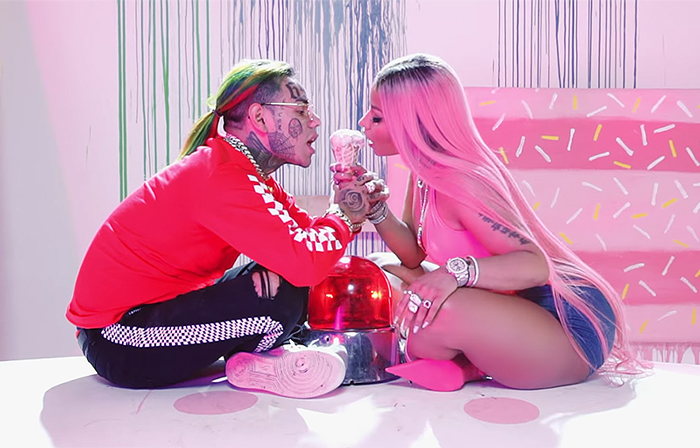 The colorful, balloon-filled clip opens with Tekashi dressed in a cheetah-print Odd Future shirt while licking an ice cream cone and playing patty-cake with Nicki on top of a van. He and Murda pull out Super Soakers as bikini-clad women twerk and parade around.