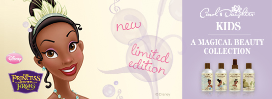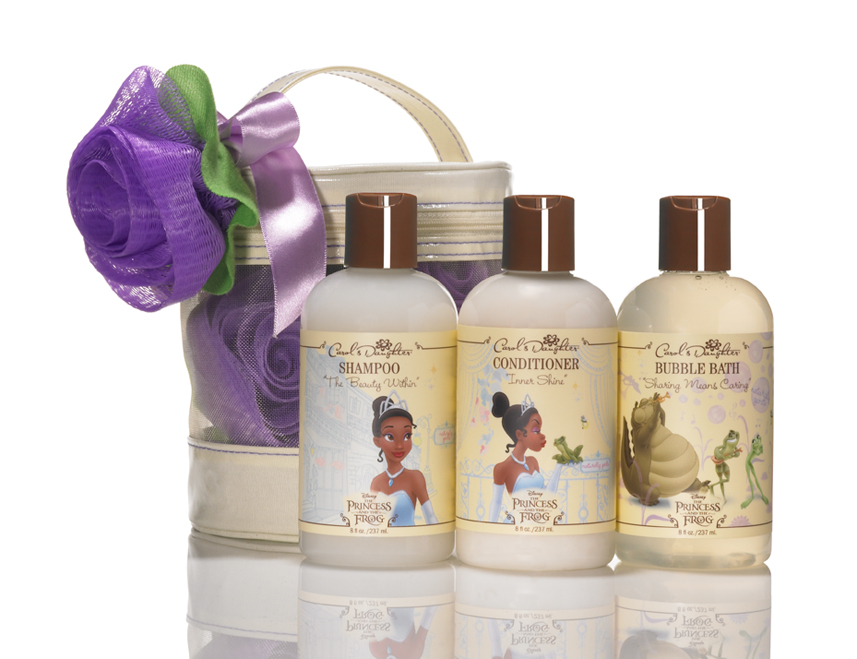 The Princess and the Frog bath collection by Carol’s Daughter is a limited limited-edition line of hair and bath & body products made with natural ingredients such as aloe leaf juice, cranberry extract, sunflower seed oil, olive oil etc. The collection includes a shampoo, conditioner, hair detangler and bubble bath packaged in packaging featuring scenes from the movie. The product line is geared for African-American hair but is suitable for all races.