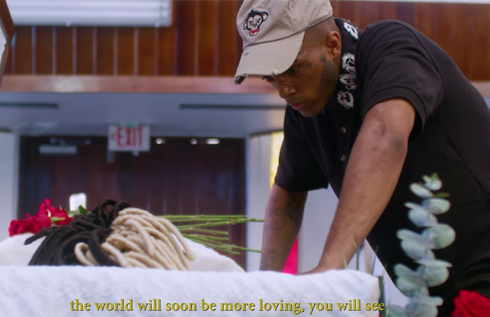 The visual is an apparent nod to X’s attempt to turn around his life around by killing off his old self. X was accused of domestic violence and was awaiting trial at the time of his death.