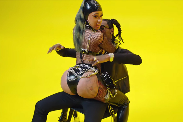 Dressed in a black latex dominatrix outfit, Kulture’s mother comes through to give her man a lap dance while giving the camera an eyeful. After straddling Offset, Cardi gets buried in a pile of lemons and twerks in a yellow-lit room while calling out the clout chasers.