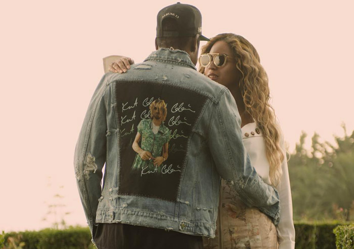 Prior to the event, the always-fashionable Carters staged a photo shoot at home. Queen Bey stunned in platform heels, along with a high-waisted Zimmerman mini-skirt, white Ellery blouse, and a Brother Vellies fur purse. Meanwhile, Jigga rocked an Amiri trucker jacket, adorned with a Kurt Cobain patch.