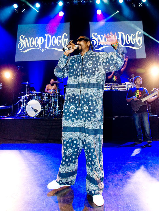 Rapper Snoop Dogg wore a bodysuit designed to look like a blue bandanna (usually worn by a group of gang members in Los Angeles known as “the Crips”) as he performed in London, England at O2 Shepherds Bush Empire Friday night (Jul 9). Snoop has said that he never joined a gang but that’s a little hard to believe when he throws the signs up, raps about it in his music and wears big blue bandannas on stage. We still love you though Snoop!